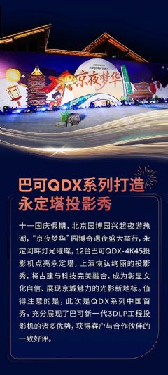 夜幕降臨,12臺巴可QDX-4K45將明亮瑰麗的光影奇觀覆蓋在永定塔上,成為園博園夜景的視覺焦點。伴隨
