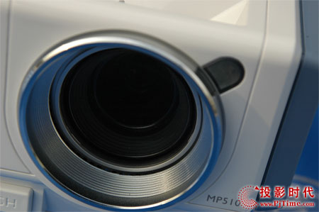 BenQ MP510投影機采用F=2.57(定焦)鏡頭,采用固定光學(xué)變焦、固定光圈鏡頭,具有手動對焦和數(shù)碼變焦功能。鏡頭保護采用常見的鏡頭蓋實現(xiàn),此外鏡頭緊緊地縮入機身內(nèi)部也能有效防止鏡頭被損傷。BenQ MP510投影機鏡頭的保護護蓋采用半透明橡膠材質(zhì)扣蓋,與鏡頭結(jié)合牢固。BenQ MP510投影機鏡頭對焦調(diào)節(jié)都位于機身內(nèi)側(cè),頂部面板的的開口內(nèi),金屬銀色,手感穩(wěn)固;同時鏡頭也縮于機身內(nèi),有助于鏡頭的保護。