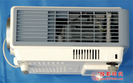 BenQ MP510投影機散熱的出氣口位于機器的正右側(cè),由兩個風(fēng)扇組成,風(fēng)扇馬力強勁。BenQ MP510投影機散熱的主進氣孔在機身左側(cè),沒有采用防塵設(shè)計,同時機身底部的燈泡換裝面板上還留有輔助散熱孔,同樣也沒有防塵設(shè)計。