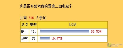 現(xiàn)在離奧運(yùn)會越來越近,很多朋友已經(jīng)按捺不住激動的心情,準(zhǔn)備開始攢購第二臺電腦。據(jù)中關(guān)村在線調(diào)查顯示,約有83.53%參與投票的玩家表示會選購第二臺電腦。這表明電腦應(yīng)用水平正在不斷提升,很多朋友由于應(yīng)用范圍在不斷擴(kuò)大,加上家庭成員都需要使用電腦,故出現(xiàn)大量攢購第二臺電腦的需求。