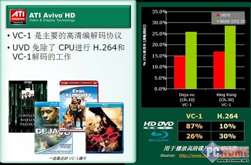 那么UVD單元也就意味著同時支持H.264和VC-1兩種主流編碼,目前來說稱霸的依然是H.264,但我們不可否認,對微軟力推的VC-1的用戶者也不在少數(shù),因為大多數(shù)HD-DVD都采用VC-1的編碼,如今網(wǎng)絡上很流行的HDTV格式影片也有很多使用VC-1壓制的。而NVIDIA的G92在高清方面的特性我們在之前的首發(fā)測評文章中已經(jīng)也清楚的認識到了,換句話說就是VC-1的影片GeForce8800GT不是全硬件解碼,而UVD則對這兩種編碼實現(xiàn)全硬件的加速,這也是AMD的Avivo-HD的過人之處。