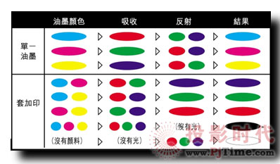 在可見光譜內(nèi),青是紅的互補色;品紅是綠的互補色;黃是藍的互補色。當青、品 紅和黃顏料印刷在白色的反射材料上時,每種顏料完全吸收 — 或減去 — 白光中 它的互補色。因此,印刷過程采用青、品紅和黃油墨以控制從白紙上反射的紅、綠 和藍光。