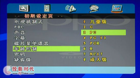 OPPODV-981HD高清播放機菜單內(nèi)還增添了不小其它播放機中沒有的功能,比如年齡控制就是很好的典范,用戶可以設(shè)定一定的等級以限制不同人群觀看不能觀看的影片。
