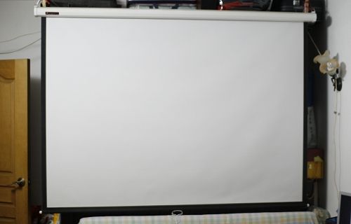 所有設(shè)備連接完成之后,由于家里比較小所以我的100寸幕是掛在衣櫥頂部,這樣不看時收起也不會影響到衣櫥門的關(guān)閉。