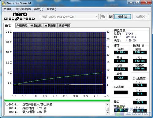 用戶在實(shí)際使用當(dāng)中,難免讀取普通的DVD+R碟片,鑒于此編輯也為建興iHOS104藍(lán)光只讀光驅(qū)提供了測(cè)試機(jī)會(huì),選取的盤片為威寶普通白盤。透過上圖我們看到其平均讀取速度6.07X,結(jié)束速度8.12X,系統(tǒng)資源占用依然表現(xiàn)良好。