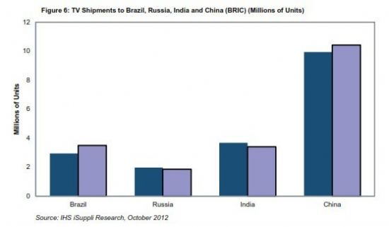 據(jù)IHS iSuppli公司的金磚國家電視市場追蹤報(bào)告,第二季度金磚國家的電視出貨量增長,中國仍然是最大的市場,但巴西超過了印度。金磚國家包括巴西、俄羅斯、印度和中國。