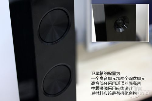 環(huán)繞音箱的設(shè)計(jì)非常獨(dú)特,頂部的散射器看起來非常有意思,頂部的音箱通過一個(gè)單元向上放送聲波,而頂部的錐形凸起能夠?qū)⒙暡ù蛏,提供更好的聲音散射效果?/P>