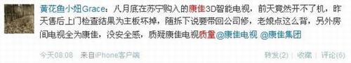 2013年1月23日,網(wǎng)友黃花魚小妞Grace在新浪微博上表示,質(zhì)疑康佳電視質(zhì)量。面對(duì)質(zhì)疑,康佳微客服首先迅速與博主取得聯(lián)系,并通過私信方式與博主進(jìn)行私密溝通,了解情況并及時(shí)向售后客服反映,委派客服專員為博主跟進(jìn)客服情況。