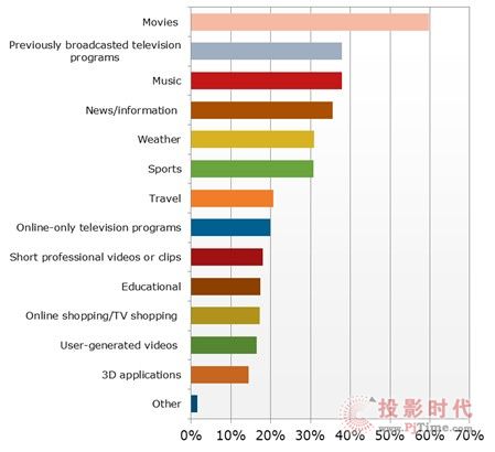 根據(jù)研究顯示,平均80%的家庭擁有至少一臺平板電視。這些家庭中,27%家庭的平板電視通過電視本身的聯(lián)網(wǎng)選項或其他連接設備連接到互聯(lián)網(wǎng)。消費者在聯(lián)網(wǎng)電視上收看各種類型的在線內(nèi)容;最受歡迎的內(nèi)容是在線電影,其次是電視臺播送的節(jié)目和音樂。