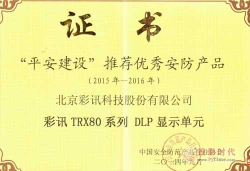 2014年10月28~30日,第十二屆中國國際社會(huì)公共安全產(chǎn)品博覽會(huì)在北京中國國際展覽中心新館隆重開幕。展會(huì)期間,由中國安防產(chǎn)品行業(yè)協(xié)會(huì)舉辦的“2014年平安建設(shè)推薦優(yōu)秀安防產(chǎn)品 ”評(píng)選結(jié)果也正式揭曉。北京彩訊科技有限公司TRX80系列DLP顯示單元在眾多優(yōu)秀的安防產(chǎn)品中表現(xiàn)出色,獲得“平安建設(shè)”推薦優(yōu)秀安防產(chǎn)品殊榮。