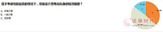“在不考慮功能因素的情況下,您是否介意電視機(jī)身的輕薄程度?”這項(xiàng)調(diào)查中,非常介意的消費(fèi)者占比36.8%,一般介意的比例為48.7%,不介意的消費(fèi)者僅為14.5%,也就是說(shuō),對(duì)國(guó)內(nèi)的大部分消費(fèi)者來(lái)說(shuō),電視機(jī)身的輕薄會(huì)很大程度的影響他們的購(gòu)買。在國(guó)內(nèi)的大部分家庭中,因?yàn)榭蛷d空間有限,盡可能減少電視所占空間,是消費(fèi)者在購(gòu)買電視時(shí)會(huì)首先考慮的問(wèn)題。