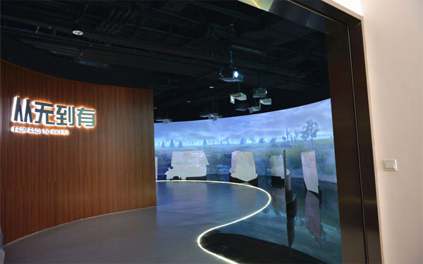 項目描述:步入展廳,首先映入眼簾的是“從無到有”展項。在這里,明基應(yīng)用6臺PW9500雙燈工程投影機(jī),采用弧形拼接的方式將畫面投射在一塊19.5m*2.7m的超大屏幕上,向參觀者全面、直觀的展示了紫竹高新區(qū)的歷史發(fā)展進(jìn)程。這種投影方式對于投影機(jī)的拼接融合效果要求極高。而PW9500的亮點之一就在于它的拼接融合功能。在PW9500優(yōu)異的融合能力下,多臺投影機(jī)實現(xiàn)了整體畫面亮度和色彩的一致性。漫步在“從無到有”展項中,我們看不到畫面有絲毫違和,整個方案渾然一體。