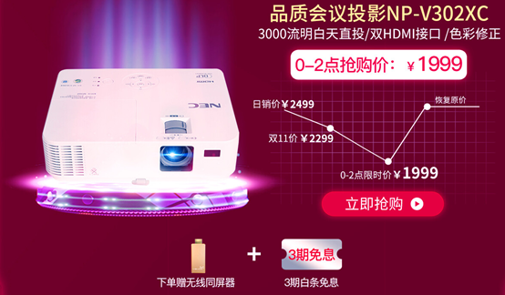 過了雙11,寒假也就不遠(yuǎn)了。不少家長為了孩子視力著想,已經(jīng)盤算著把家里電視換成投影機,好給孩子上網(wǎng)課。這里推薦一款NEC V302XC投影機,雙11跌破底價,秒殺價1999元,限時限量30臺,手慢無,活動結(jié)束將恢復(fù)原價。另外購買即贈HDMI無線投屏器,趕快把鬧鐘定起來吧。