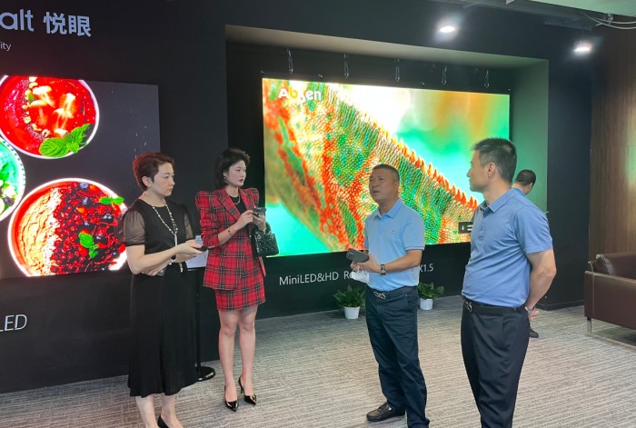 在任永紅董事和陳楊副總裁的陪同下,福摩貝斯團(tuán)隊(duì)首先參觀了總部展廳,了解到艾比森的核心產(chǎn)品與最新技術(shù)。隨著LED顯示行業(yè)市場(chǎng)規(guī)模不斷擴(kuò)大,小間距LED顯示持續(xù)發(fā)力,陳楊副總裁為福摩貝斯團(tuán)隊(duì)重點(diǎn)介紹了艾比森集團(tuán)針對(duì)Mini LED封裝所采用的先進(jìn)IMD集合封裝技術(shù)和COB技術(shù)以及模塊化輸出方案,展示了艾比森強(qiáng)大的科研生產(chǎn)能力與行業(yè)帶動(dòng)力。