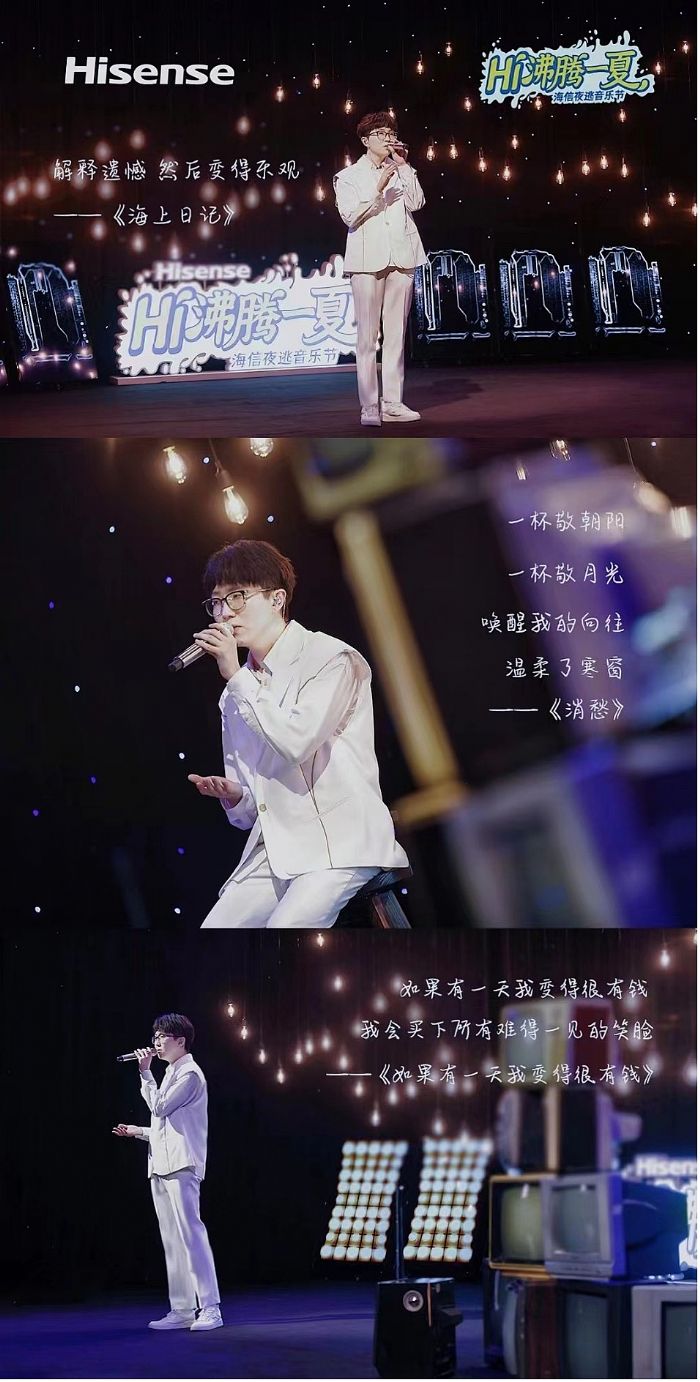 壓軸出場的毛不易在長沙現(xiàn)身,先后演唱《如果有一天我變得有錢》《海上日記》《消愁》三首膾炙人口的經(jīng)典歌曲,讓觀眾大飽耳福。毛不易說,這次他和海信一起嘗試做一場特別的演唱會,希望大家可以暫時把壓力放下,用心去聽、去看、去感受很沸騰的夏日live。