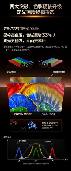 畫質方面,分區(qū)數(shù)量和控光能力,是決定好畫質的核心。M7通過Mini LED高密度精準點控光,五百級分區(qū)專燈專控,帶來更高的亮暗對比度和豐富色彩層次。針對用戶觀看時環(huán)境光干擾的問題,超分子低反射霧面涂層,無論是午后驕陽還是客廳主燈直射,也能大幅減少反射現(xiàn)象,防止屏幕眩光影響觀感;配備德國萊茵低藍光認證,護眼與好畫質兼得。燈珠創(chuàng)新升級超級馭光Lamp,通過獨特光路結構實現(xiàn)超高折射率和超級光路聚焦,從源頭處實現(xiàn)更高光通量及更少光暈。通過12bit色輪引擎對色彩進行點對點精細還原,無論環(huán)境光、場景、內容如何變化,都能將HDR電影、游戲原片質感進行無損還原,令畫面中的光色更加精準,動態(tài)還原親眼所見的自然原彩本色。此外搭載AI超感知畫質引擎,超感知先進畫質算法智能識別,并逐幀調校畫面細微參數(shù),秒出大片影像。