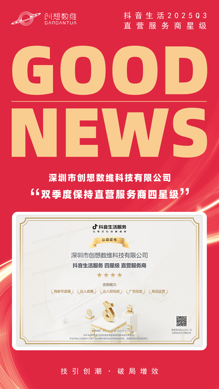 自2025年第二季度,創(chuàng)想數(shù)維在抖音生活服務(wù)板塊正式獲評“四星星級認(rèn)證服務(wù)商”后,我們保持專業(yè)水準(zhǔn)不斷深耕抖音生態(tài),以XR虛擬拍攝技術(shù)賦能商家,以創(chuàng)意營銷突破困境實現(xiàn)業(yè)績增長。