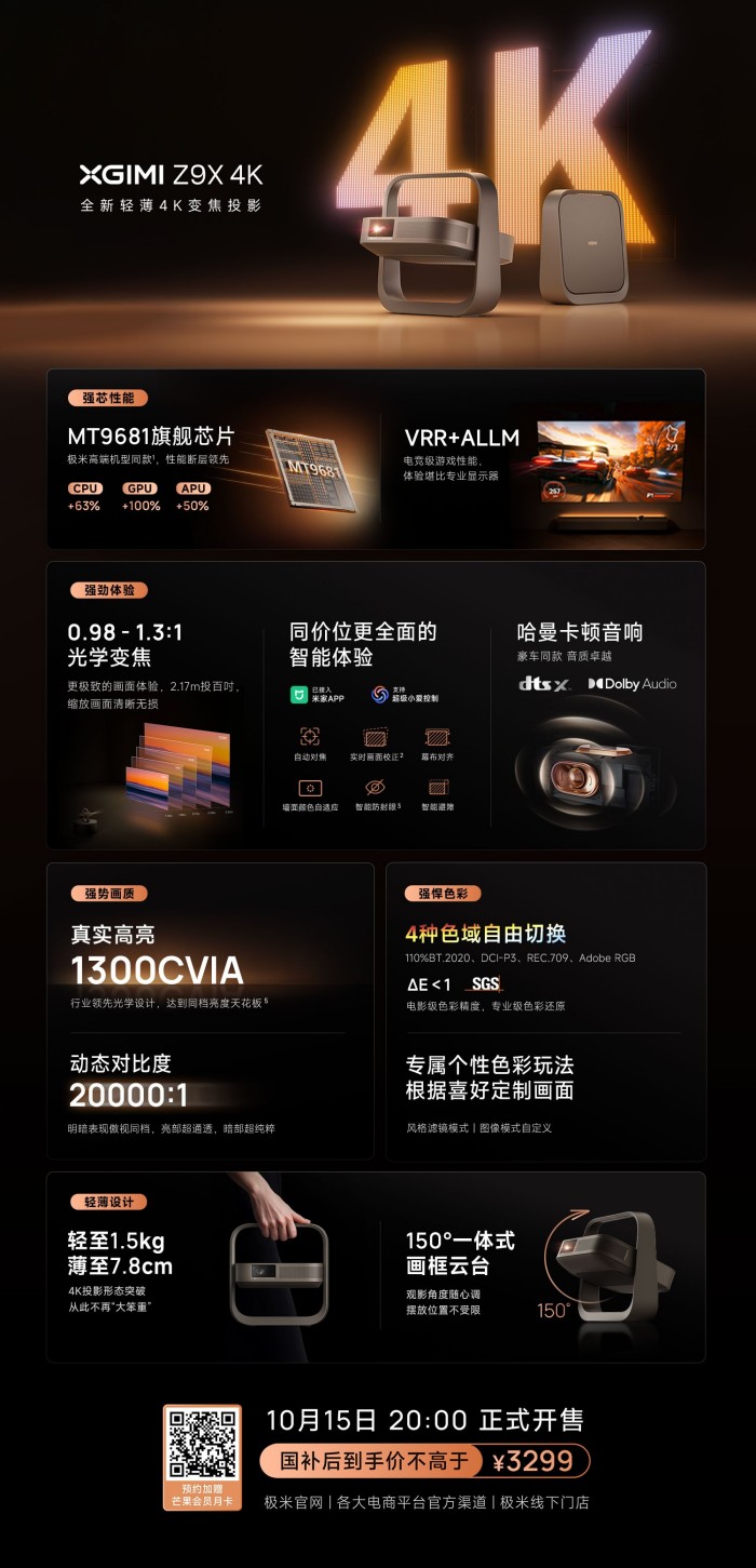 當(dāng)4K投影仍被束縛在體積大、擺放難、不易挪動等常規(guī)認(rèn)知時,極米 Z9X 4K以強者姿態(tài)輕裝上陣,目前全平臺已開啟超前預(yù)約,國補后到手價不超過3299元。10月15日晚上8點,極米 Z9X 4K將在極米官網(wǎng)及小程序、線下門店、各大電商平臺正式現(xiàn)貨開售,疊加雙十一大促福利政策還有更多驚喜釋放。