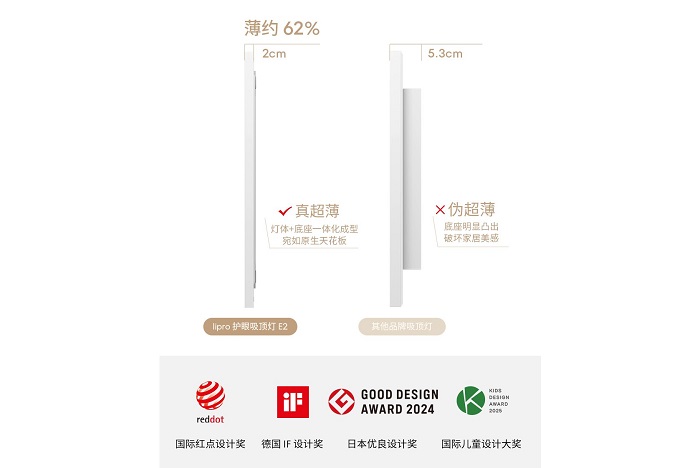 在工業(yè)設計上,lipro開創(chuàng)性地將手機級超薄理念引入照明領域,圓形臥室吸頂燈厚度被壓縮至驚人的2cm,視覺厚度也較傳統(tǒng)吸頂燈減薄62%。這種「隱于無形」的極致超薄設計,不僅極大提升了空間的美觀度和科技感,也徹底改變了吸頂燈在家居中的角色。lipro多款產(chǎn)品相繼獲得國際紅點設計獎、德國IF設計獎、日本優(yōu)良設計獎、國際兒童設計大獎。