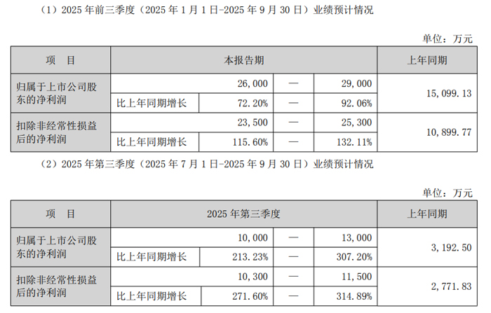 從單季度表現(xiàn)來(lái)看,2025 年第三季度(7 月 1 日 - 9 月 30 日)公司業(yè)績(jī)?cè)鏊龠M(jìn)一步加快。其中,歸屬于上市公司股東的凈利潤(rùn)預(yù)計(jì)為 1 億元 - 1.3 億元,較上年同期的 3192.50 萬(wàn)元同比增長(zhǎng) 213.23%-307.20%;扣除非經(jīng)常性損益后的凈利潤(rùn)預(yù)計(jì)為 1.03 億元 - 1.15 億元,較上年同期的 2771.83 萬(wàn)元同比大漲 271.60%-314.89%,單季業(yè)績(jī)?cè)鏊龠h(yuǎn)超前三季度整體水平,顯示公司下半年業(yè)務(wù)景氣度持續(xù)攀升。