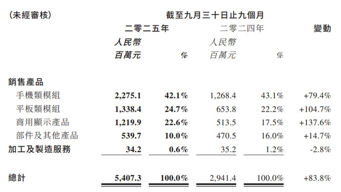 平板類模組營(yíng)收 13.384 億元,同比增長(zhǎng) 104.7%,占總營(yíng)收 24.7%;