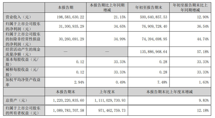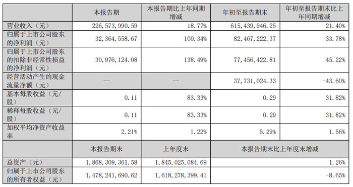 從年初至報告期末(即 2025 年前三季度),公司整體業(yè)績同樣表現(xiàn)亮眼。前三季度累計實(shí)現(xiàn)營業(yè)收入 6.15 億元(615,439,946.25 元),同比增長 21.40%;歸屬于上市公司股東的凈利潤 8246.72 萬元(82,467,222.37 元),同比增長 33.78%;扣非后歸母凈利潤 7745.64 萬元(77,456,422.81 元),同比增長 45.22%,增長勢頭持續(xù)強(qiáng)勁。加權(quán)平均凈資產(chǎn)收益率為 5.29%,較上年同期提升 1.56 個百分點(diǎn),資產(chǎn)盈利效率進(jìn)一步優(yōu)化。
