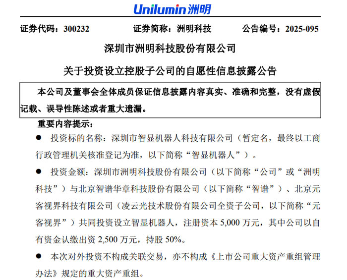 2025 年 10 月 24 日,深圳市洲明科技股份有限公司(證券代碼:300232,簡稱 “洲明科技”)發(fā)布自愿性信息披露公告,宣布與北京智譜華章科技股份有限公司(簡稱 “智譜”)、北京元客視界科技有限公司(凌云光技術(shù)股份有限公司全資子公司,簡稱 “元客視界”)達(dá)成戰(zhàn)略合作,共同投資設(shè)立深圳市智顯機(jī)器人科技有限公司(暫定名,最終以工商核準(zhǔn)為準(zhǔn),簡稱 “智顯機(jī)器人”)。此次合資公司注冊(cè)資本 5000 萬元,三方將整合核心技術(shù)優(yōu)勢(shì),構(gòu)建 AI 智能終端創(chuàng)新生態(tài),推動(dòng)智能體在教育、會(huì)議、文旅等場(chǎng)景的 “顯示具身化” 落地,助力行業(yè)智能化升級(jí)。
