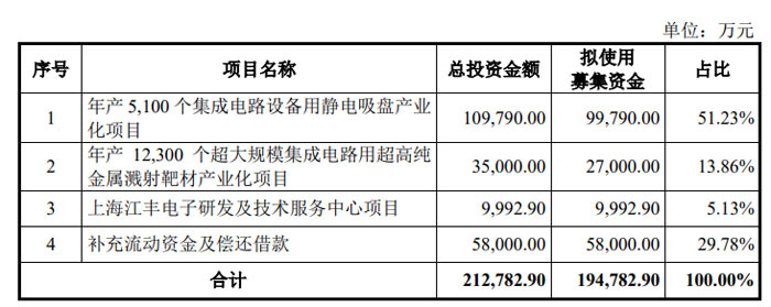 根據(jù)江豐電子10月23日發(fā)布的募集說(shuō)明書(shū)(申報(bào)稿),本次計(jì)劃通過(guò)定增募資不超過(guò) 19.48 億元,扣除 2000 萬(wàn)元財(cái)務(wù)性投資后,重點(diǎn)投向集成電路設(shè)備用靜電吸盤(pán)、超高純金屬濺射靶材產(chǎn)業(yè)化及研發(fā)中心建設(shè),并補(bǔ)充流動(dòng)資金四大項(xiàng)目。