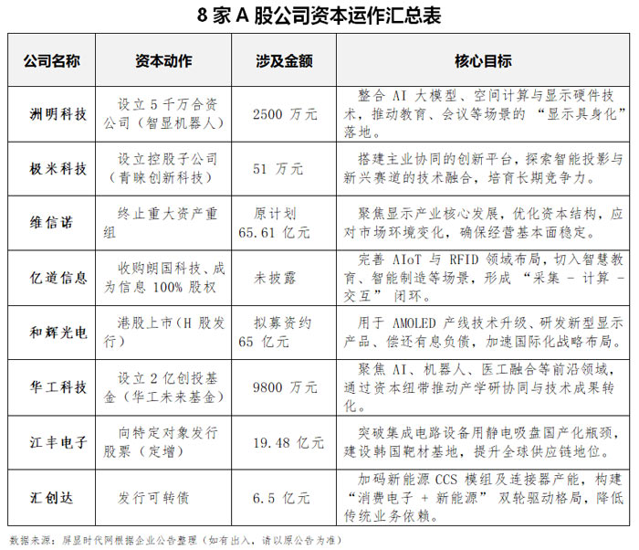 十月下旬,科技領(lǐng)域資本運(yùn)作熱潮不斷。近日,洲明科技、極米科技、維信諾、和輝光電、億道信息、華工科技、江化微、匯創(chuàng)達(dá)等多家行業(yè)代表性企業(yè)密集發(fā)布公告,通過(guò)設(shè)立合資公司、收購(gòu)股權(quán)、發(fā)起創(chuàng)投基金、發(fā)行可轉(zhuǎn)債、港股上市等多元資本動(dòng)作,在 AI 智能終端、智慧商顯、新型顯示、新能源電子、半導(dǎo)體材料等領(lǐng)域加速布局。