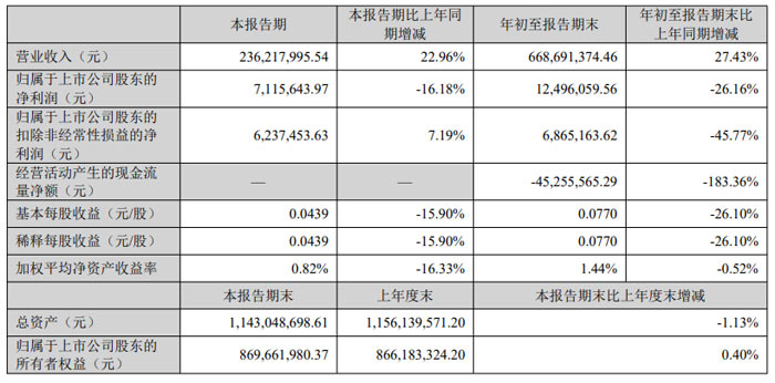 年初至報告期末表現(xiàn):1-9 月累計實現(xiàn)營業(yè)收入 5.50 億元,同比減少 11.64%;歸屬于上市公司股東的凈利潤為 - 110.38 萬元,同比下降 119.64%;扣非后凈利潤為 - 634.31 萬元,同比降幅擴大至 1020.52%。