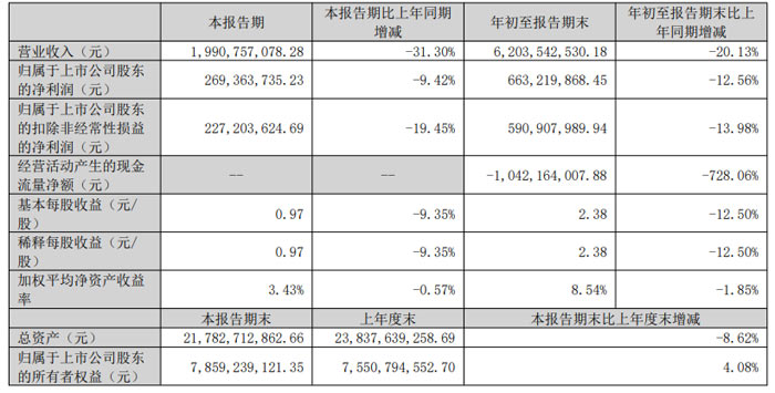 年初至報告期末:邁為股份累計實現(xiàn)營業(yè)收入 62.04 億元,同比減少 20.13%;歸屬于上市公司股東的凈利潤 6.63 億元,同比下降 12.56%;扣非后凈利潤 5.91 億元,同比下降 13.98%;久抗墒找 2.38 元 / 股,同比下降 12.50%。