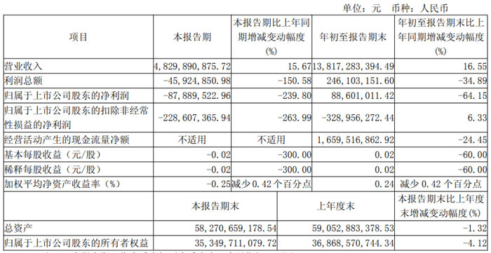 每股收益方面,本報告期基本每股收益為 - 0.0242 元 / 股,年初至報告期末為 - 0.1328 元 / 股,同比均出現(xiàn)大幅下滑,降幅分別為 510.17% 和 850.28%。