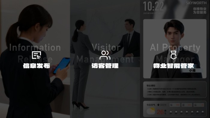 基于這一方向,酷開科技敏銳洞察到物業(yè)行業(yè)在服務智能化、管理數(shù)據(jù)化、品牌高端化的升級需求,聯(lián)合旗下重點孵化的智能梯媒企業(yè)創(chuàng)視科技,深度整合自身AI原生技術底座與創(chuàng)視的垂直場景運營優(yōu)勢,共同推出融合 “百寸大屏 +AI管理終端” 的整體解決方案——AI物業(yè)服務平臺,以 “小程序為客戶端 + 大屏為展示終端” 的核心架構,涵蓋掌上信息發(fā)布、訪客管理、AI物業(yè)智能管家三大核心功能,助力傳統(tǒng)樓宇在管理及服務上的智能化躍遷。