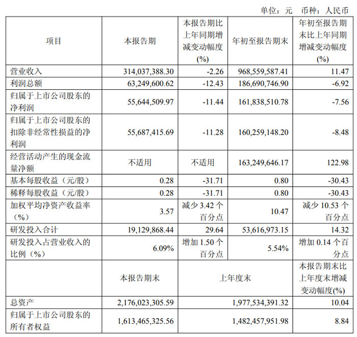 報告期內(nèi)(2025 年第三季度),公司實現(xiàn)營業(yè)收入 3.14 億元,較上年同期的 3.21 億元同比下降 2.26%;歸屬于上市公司股東的凈利潤為 5564.45 萬元,較上年同期的 6283.38 萬元同比下降 11.44%。