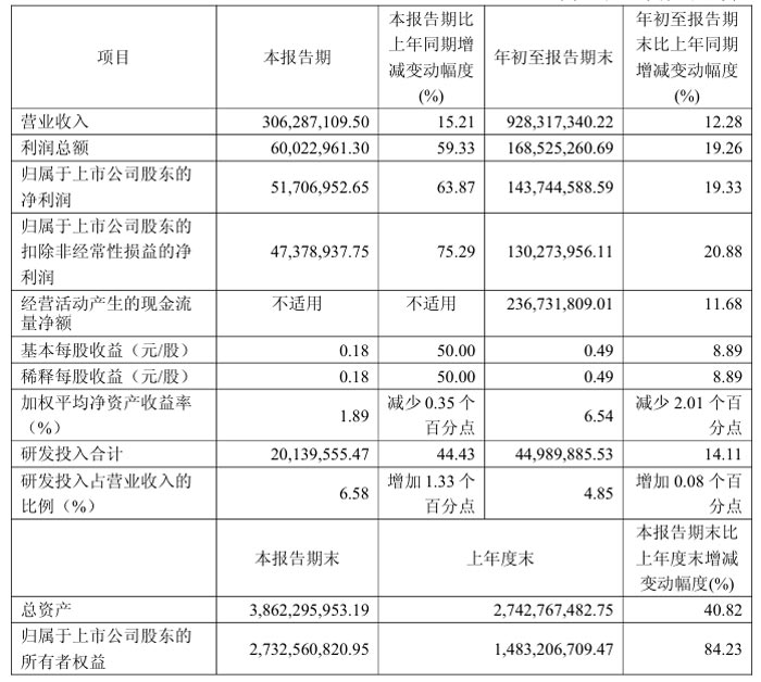 2025 年第三季度,公司實現(xiàn)營業(yè)收入 3.06 億元,較上年同期的 2.65 億元增長 15.21%;歸屬于上市公司股東的凈利潤 5170.69 萬元,較上年同期的 3155.33 萬元大幅增長 63.87%;歸屬于上市公司股東的扣除非經(jīng)常性損益的凈利潤 4737.89 萬元,較上年同期的 2703.03 萬元增長 75.29%,盈利能力顯著提升。