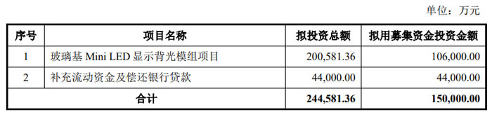 本次募集資金中,10.6 億元擬投入 “玻璃基 Mini LED 顯示背光模組項(xiàng)目”,4.4 億元用于補(bǔ)充流動(dòng)資金及償還銀行貸款。其中,玻璃基 Mini LED 顯示背光模組項(xiàng)目由公司全資子公司江西德虹實(shí)施,總投資 20.06 億元,建設(shè)期 24 個(gè)月,達(dá)產(chǎn)后將實(shí)現(xiàn)年產(chǎn) 605 萬(wàn)片玻璃基 Mini LED 顯示背光模組的產(chǎn)能。