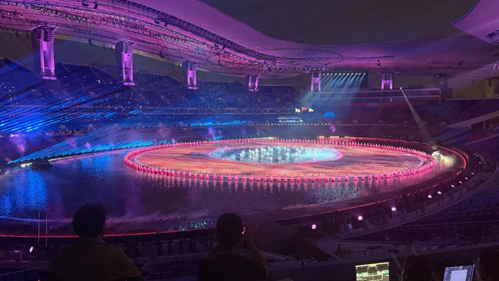 本屆開幕式以“圓夢(mèng)未來(lái)”為主題,融合家國(guó)情懷、灣區(qū)魅力等元素,采用“體育+藝術(shù)+科技”創(chuàng)新思路,設(shè)置“同根同源”“同心同緣”“同夢(mèng)同圓”三個(gè)篇章,借助數(shù)字技術(shù)、虛擬現(xiàn)實(shí)等創(chuàng)新手段,充分展現(xiàn)高科技與體育盛事的深度融合。