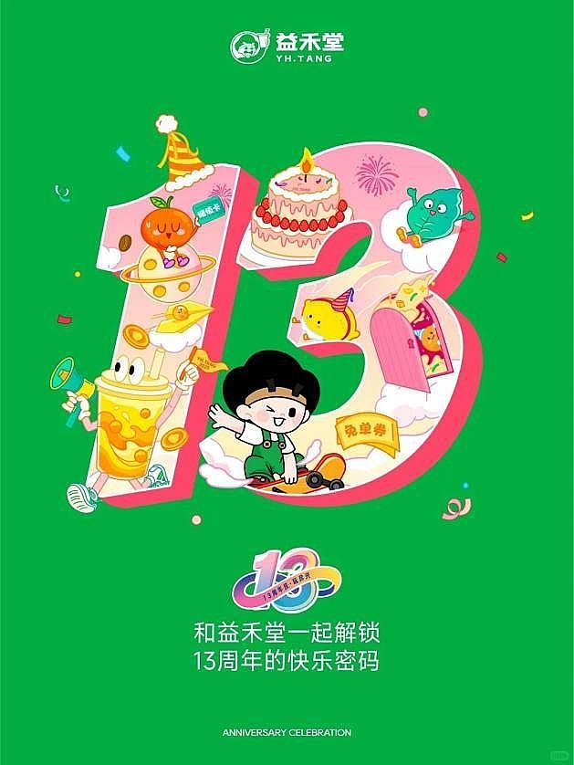 沉淀十三載,煥新再出發(fā)。益禾堂以“13周年慶·玩盡興”為主題,通過(guò)“六大城市線(xiàn)下聯(lián)動(dòng)+全國(guó)線(xiàn)上狂歡”的雙線(xiàn)布局,打造一場(chǎng)真正以用戶(hù)為中心的品牌派對(duì)。從情感共創(chuàng)到實(shí)感福利,益禾堂正以更年輕、更具感染力的表達(dá),重新定義新茶飲品牌周年慶的打開(kāi)方式。