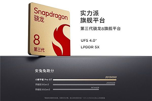一、性能越級(jí):同價(jià)位罕見的旗艦芯體驗(yàn) 1.旗艦級(jí)芯片奠定性能基石在多數(shù)同價(jià)位平板仍采用中端處理器時(shí),聯(lián)想小新平板 Pro GT 的芯片搭載了高通第三代驍龍 8 旗艦平臺(tái),實(shí)測(cè)安兔兔跑分突破 200 萬分,與同樣搭載驍龍 8 Gen3 但價(jià)位更高的競(jìng)品持平,比搭載驍龍 8s Gen3 的同級(jí)產(chǎn)品領(lǐng)先 27%。