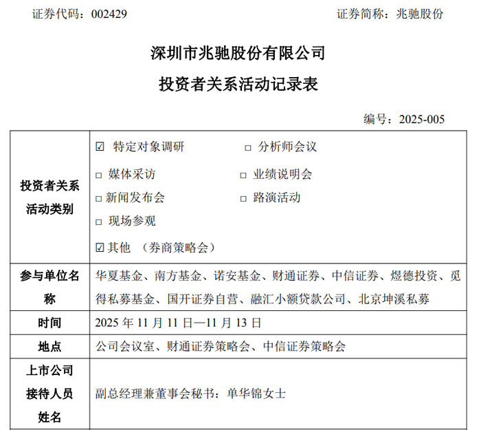 2025 年 11 月 11 日至 13 日,深圳市兆馳股份有限公司(證券代碼:002429)接受特定對(duì)象調(diào)研,與華夏基金、南方基金、諾安基金等多家知名投資機(jī)構(gòu)展開(kāi)深度交流。公司副總經(jīng)理兼董事會(huì)秘書(shū)單華錦女士全面介紹行業(yè)及公司近況,詳解芯片半導(dǎo)體、Micro LED 光互連、PCB 業(yè)務(wù)等核心領(lǐng)域的技術(shù)成果與戰(zhàn)略規(guī)劃,彰顯公司在高端電子制造領(lǐng)域的綜合競(jìng)爭(zhēng)力。