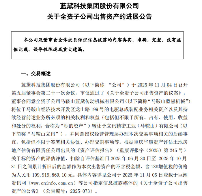 公告顯示,截至 11 月 16 日,馬鞍山藍黛機械已與交易對手方立訊精密工業(yè)(馬鞍山)有限公司(下稱 “馬鞍山立訊”)正式簽署《資產(chǎn)轉(zhuǎn)讓協(xié)議》,本次交易涉及的全部資產(chǎn)交割手續(xù)均已辦理完畢。