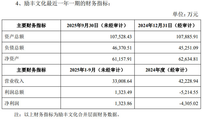 作為受讓方的勵(lì)豐文化成立于 1997 年,注冊資本 1 億元,業(yè)務(wù)覆蓋景觀工程、數(shù)字文創(chuàng)、設(shè)備租賃、技術(shù)研發(fā)等多個(gè)領(lǐng)域,是文旅夜游項(xiàng)目落地的關(guān)鍵執(zhí)行平臺(tái)。財(cái)務(wù)數(shù)據(jù)顯示,公司經(jīng)營狀況持續(xù)改善,2025 年 1-9 月實(shí)現(xiàn)營業(yè)收入 3.3 億元,凈利潤 1323.86 萬元,成功扭轉(zhuǎn) 2024 年凈虧損 4305.02 萬元的局面;截至 2025 年 9 月 30 日,其資產(chǎn)總額達(dá) 10.75 億元,凈資產(chǎn) 6.12 億元,財(cái)務(wù)基礎(chǔ)穩(wěn)健。