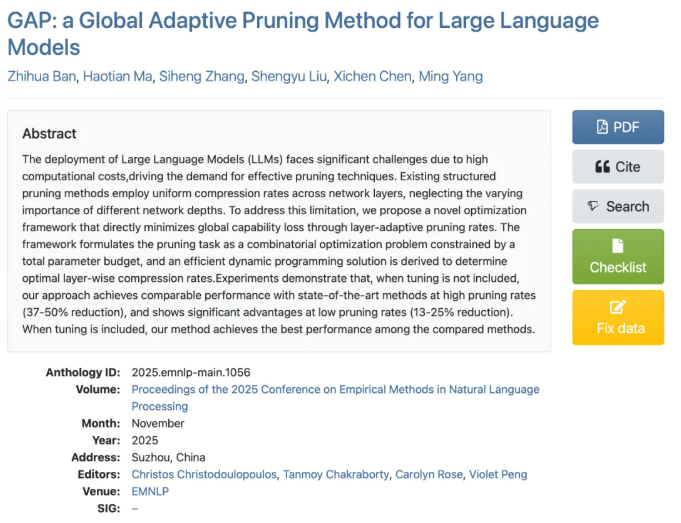 視源AI團(tuán)隊(duì)的研究成果基于大模型不同模塊對(duì)精度影響存在差異的觀察,提出一種自適應(yīng)的剪枝方法,該方法將剪枝問題轉(zhuǎn)換成一個(gè)組合優(yōu)化問題,并通過嚴(yán)謹(jǐn)?shù)臄?shù)學(xué)推導(dǎo)將求解的時(shí)間復(fù)雜度從指數(shù)級(jí)化簡(jiǎn)為多項(xiàng)式級(jí)。經(jīng)試驗(yàn)驗(yàn)證,該方法不僅在非微調(diào)方法中獲得較好的效果,在微調(diào)方法中也超越了當(dāng)前的先進(jìn)水平。相關(guān)技術(shù)論文已被頂會(huì)EMNLP主會(huì)接受,獲得了國(guó)際學(xué)術(shù)界對(duì)該方法的認(rèn)可。