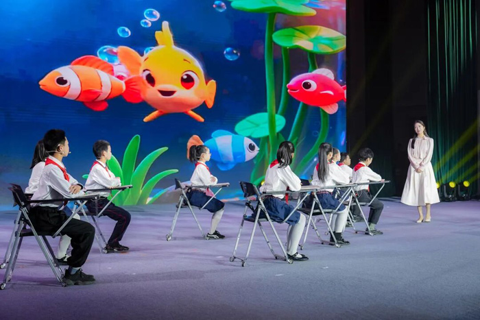 作為教育創(chuàng)新的重要推動(dòng)力,科技手段的融入為本次活動(dòng)注入了全新活力。無錫羿飛教育特別打造的全息投影舞臺(tái),以高流明激光投影機(jī)為核心,結(jié)合定制化沙幕系統(tǒng),實(shí)現(xiàn)了對舞臺(tái)劇《心壺》的沉浸式呈現(xiàn)!缎膲亍芬孕撵`成長為主題,通過全息技術(shù)將抽象的情感與哲思轉(zhuǎn)化為具象的三維影像:流動(dòng)的光影構(gòu)建出虛實(shí)交織的場景,人物與虛擬元素的互動(dòng)打破舞臺(tái)物理邊界,觀眾仿佛置身于故事之中,與角色共情共鳴。這種突破傳統(tǒng)舞臺(tái)形式的呈現(xiàn)方式,不僅提升了藝術(shù)表現(xiàn)力,更讓教育理念的傳遞更加生動(dòng)深刻。