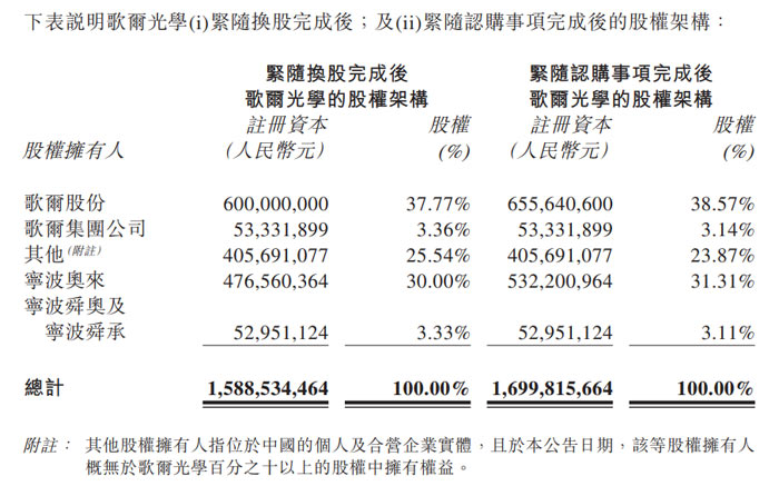 換股完成后,歌爾光學(xué)注冊資本增至 1,588,534,464 元人民幣,股權(quán)結(jié)構(gòu)調(diào)整為:歌爾股份持股比例降至 37.77%(注冊資本保持 6 億元人民幣),歌爾集團(tuán)公司持股 3.36%(注冊資本不變),其他股東持股 25.54%;寧波奧來、寧波舜奧及寧波舜承通過換股方式新增持股,其中寧波奧來持有 30.00% 股權(quán)(對應(yīng)注冊資本 476,560,364 元人民幣),寧波舜奧及寧波舜承合計持有 3.33% 股權(quán)(對應(yīng)注冊資本 52,951,124 元人民幣)。