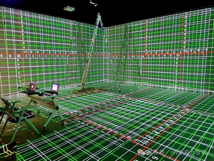 要實現(xiàn)墻面 + 地面的全域投影,12 臺設(shè)備的畫面拼接是核心難點。HT-L752UA 的精準融合能力,讓調(diào)試時的 “網(wǎng)格校準” (圖中綠色定位線) 最終化作 “無邊界” 的視覺體驗:從這臺機器投射的 “星球” ,能自然銜接另一臺機器的 “星云帶”,地面云海與墻面星際場景無縫銜接,全程無斷層、無色彩偏差。