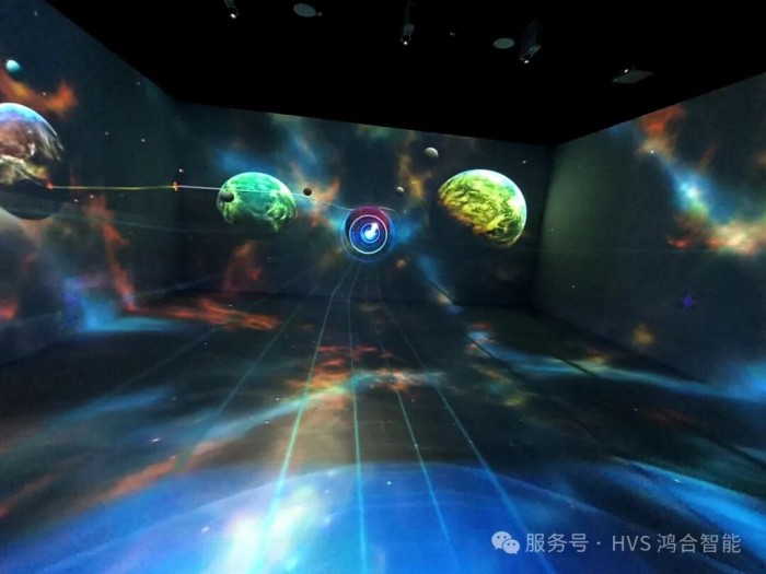 不同于單一墻面投影,這里的投影覆蓋了墻面 + 地面:訪客站在空間中央,會被星際、云海、城市景觀全方位包裹 —— “踩在云里” “身處星際航道” 的體感,讓客戶從 “看展示” 變成 “走進打印場景”,品牌記憶點直接拉滿。