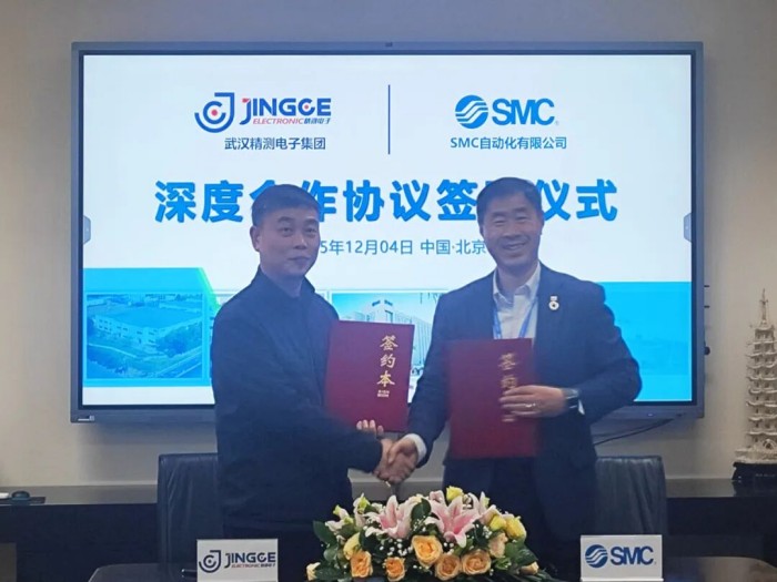 精測(cè)電子集團(tuán)董事、副總經(jīng)理劉榮華(左)與SMC自動(dòng)化有限公司總經(jīng)理馬海清(右)出席簽約儀式