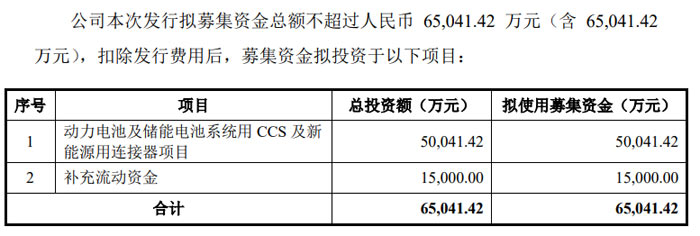 募集資金中,50,041.42 萬元將投入 “動(dòng)力電池及儲能電池系統(tǒng)用 CCS 及新能源用連接器項(xiàng)目”,項(xiàng)目達(dá)產(chǎn)后將新增年產(chǎn) CCS 模組 500 萬套和新能源用連接器 4800 萬個(gè),進(jìn)一步擴(kuò)大公司在新能源領(lǐng)域的產(chǎn)能規(guī)模;15,000 萬元用于補(bǔ)充流動(dòng)資金,將有效優(yōu)化公司資金結(jié)構(gòu),支撐主營業(yè)務(wù)持續(xù)發(fā)展。