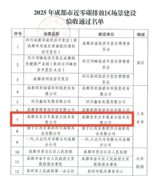 近日,京東方精電成都車載顯示基地憑借在綠色低碳發(fā)展領(lǐng)域的系統(tǒng)性建設(shè)與顯著成效,經(jīng)成都市生態(tài)環(huán)境局等七部門嚴(yán)格評(píng)估,正式通過“成都市近零碳排放工業(yè)企業(yè)”驗(yàn)收,成為成都市唯一通過驗(yàn)收的車載顯示企業(yè),這也是繼2024年獲評(píng)“四川省綠色工廠”后的又一權(quán)威認(rèn)證,標(biāo)志著京東方精電在綠色智能制造和可持續(xù)發(fā)展道路上再次樹立行業(yè)新標(biāo)桿。